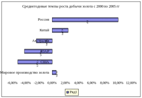 Рис. 24. Среднегодовые темпы роста добычи золота с 2000 по 2005 гг.