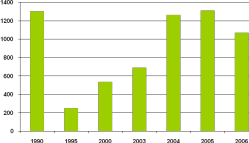 Общий объем рынка телевизоров в России растет темпом 10-25% в год. В 2001 г. общий объем продаж данного вида продукции составлял 3,5 млн. шт., в 2002 г. – 5 млн., в 2003 – 6,2 млн., в 2004 -7,3 млн., в 2005 – 8 млн. Согласно расчетам DISCOVERY Research Group объем продаж телевизоров в 2006 году составил 9,7 млн. шт., в стоимостном выражении этот показатель соответствует 4,685 млрд. долл. против 2,8 млрд. долл. в 2005 году (см. рисунок 10).