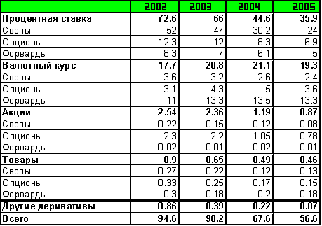 Наиболее активные игроки в торговле производными финансовыми инструментами - крупные инвестиционные и коммерческие банки. Неудивительно поэтому, что на внебиржевом рынке хеджируются в основном колебания процентных ставок (76,7%) и валютных курсов (18,7%). В этой связи увеличение зависимости мировой экономики от нерегулируемого внебиржевого рынка производных инструментов не может не вызывать серьезных опасений. Невыполнение обязательств одним крупным участником может повлечь к кризису многих других по цепочке. Даже российская банковская система до сих пор не может прийти в себя после августовского дефолта во многом из-за форвардных обязательств отечественных банков перед нерезидентами и российскими контрагентами.