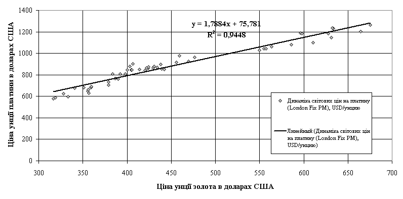 Одночасно, підтверджений сильний кореляційний зв’язок між курсом золота (ведучий курс) та курсами інших дорогоцінних металів – платини та срібла, які практично лінійно наслідують зміни курсів на золото.