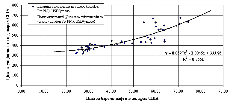 Рис. 2.12. Кореляційно регресійний зв’язок цін на золото та цін на нафту у 2002 –2006 роках