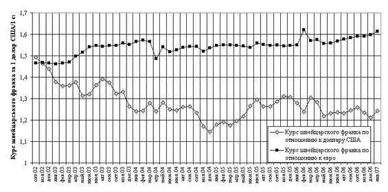 Рис.2.9. – Курсове падіння долара США до найстабільнішої валюти – швейцарського франка у 2002 –2007 роках [53]