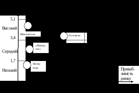 Привабливість ринку = 0,2*3 + 0,08*4 + 0,15*3 + 0,15*4 + 0,2*2 = 2,37