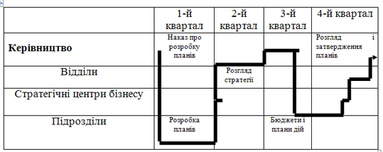 Процес стратегічного планування є безперервним річним циклом робіт, в якому беруть участь практично всі підрозділи підприємства. Як правило, кінцевий варіант плану і бюджету розглядає комітет зі стратегічного планування, а затверджує плани вище керівництво. На рис. 2.6 показано календарний план процесу стратегічного планування, розроблений для ЗАТ "Київський завод шампанських вин "Столичний".