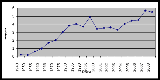 Аналізуючи рисунок 2.7, можна визначити, що виробництво шампанських вин з 1940 р. до 1995 р. мало стрімкий злет. З 2000 по 2003 роки спостерігається незначне зниження виробництва, і з 2004 р. знову зростання. Найбільша кількість шампанського вина була вироблена підприємствами України в 1995 р.