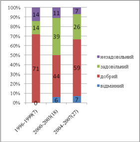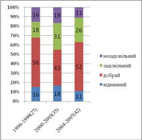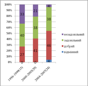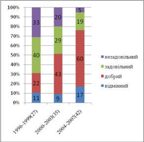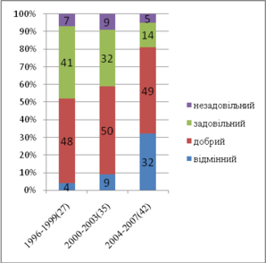 | Рік оцінювання | Незадовільний | Задовільний | Разом | Добрий | Відмінний | Загальний | К-ть проектів |