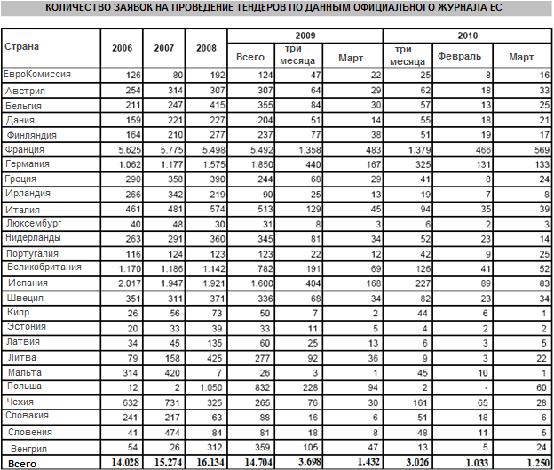 Источник: OICE Monthly Survey on European Calls for Tenders Concerning Engineering Services, March 31, 2010.