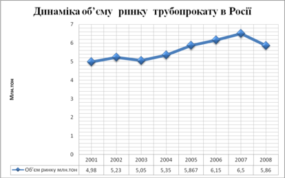 У 2008 році істотно зріс попит на труби з боку нафтових компаній і «Газпрому» у зв'язку із збільшенням витрат на ремонт старих і прокладку нових трубопровідних шляхів і появою у компаній вільних засобів на ці цілі на тлі сприятливої зовнішньоекономічної кон'юнктури. Що сприяло збільшенню імпорту труб до Росії [25].