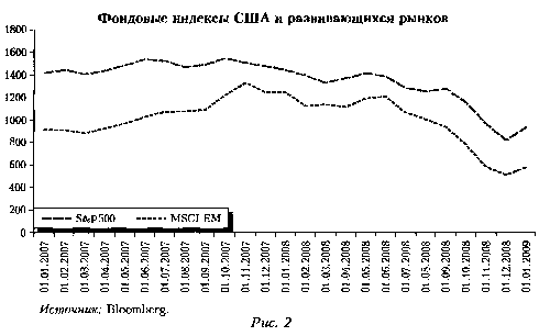 В 2007 г. фондовые рынки развивающихся стран росли опережающими темпами по сравнению с развитыми странами, чему способствовали портфельные инвестиции из ведущих мировых экономик. В 2008 г. массированный приток средств из-за рубежа на развивающиеся рынки прекратился, и динамика фондового индекса для развивающихся стран практически повторяет динамику ведущего американского фондового индекса. За 2008 г. индекс S&P 500 сократился почти на 40%, а индекс MSCI ЕМ - более чем на 50%.