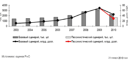Рис. 2. Сценарии развития автомобильного рынка в Республике Корея в 2010 году, тыс. шт. и млрд. долл. США