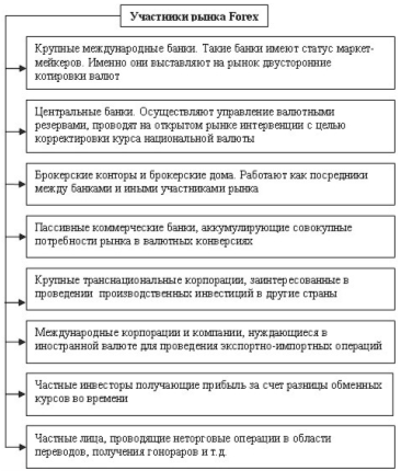 К основным участникам международного валютного рынка помимо крупных банков, фактически формирующих валютные курсы, относят также финансовые и брокерские компании, инвестиционные, пенсионные и другие фонды. Они и делают основную "погоду" на рынке. Кроме того, в последнее время возросла роль центральных банков, в задачи которых входит валютное регулирование на внешних рынках: предотвращение резких скачков курсов национальных валют с целью недопущения экономических кризисов, поддержания торгового и платежного балансов и так далее. И наконец, на рынке работают мелкие и средние инвесторы, целью которых является получение прибыли за счет изменения курсов валют. Участие мелких и средних инвесторов стало возможно благодаря посреднической деятельности дилинговых компаний. Во многих странах средние и мелкие инвесторы имеют выход на мировой валютный рынок, используя в своих операциях суммы от 10 тысяч долларов США.