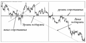 возникают, когда покупатели больше либо не могут, либо не хотят покупать данный товар по более высоким ценам. Давление продавцов превосходит давление со стороны покупателей, в результате рост останавливается и сменяется падением. Одной из важных разновидностей линий сопротивления являются уровни сопротивления – линии параллельные оси времени. Это своего рода «забор» на пути ценового графика. Вероятность прорыва цены за этот «забор» намного меньше, чем вероятность «отскока» от него. Однако, после прорыва цены за уровень сопротивления (критерии прорыва бывают разные для разных графиков, но обычно это 20-30 пунктов) этот уровень становится уровнем поддержки. Тоже самое можно сказать о прорыве линии сопротивления – она становится линией поддержки.