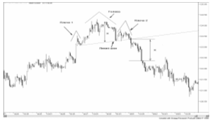 “Голова-плечи” - Эта модель является, по сути, основной в фигурах разворота тренда и все остальные модели разворота, рассматриваемые в классических учебниках, являются лишь частными случаями этой модели. На приведенном ниже рисунке показана разворотная фигура «Голова-Плечи» на бычьем тренде.