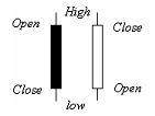 3. Японские свечи (строятся по аналогии с барами). Прямоугольник между ценами открытия (open) и закрытия (close) называют телом свечи, а черточки от тела свечи до максимального (high) и минимального (low) значения цены на данном временном отрезке называют тенью.