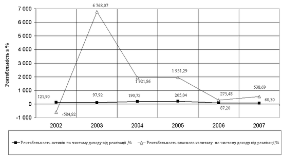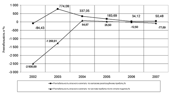 Рис.3.11. - Динаміка показників рентабельності власного капіталу по реалізаційному та чистому прибутку в АТЗТ компанія "Бастіон" у 2002 – 2007 роках