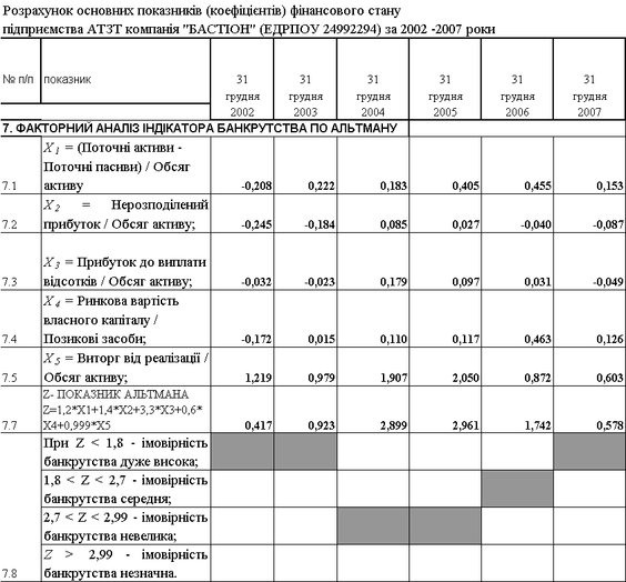 Оцінка ризику банкрутства АТЗТ “Бастіон” по Альтману у 2002 –2007 роках