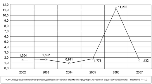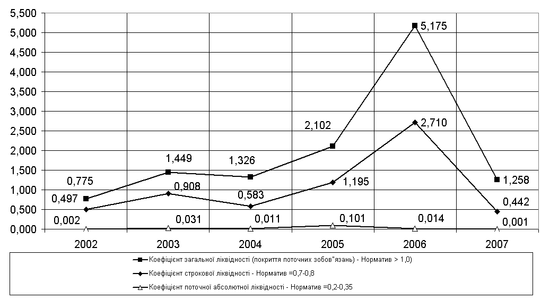 підприємство у 2003 – 2005 роках значно підвищило рівень загальної та строкової ліквідності до рівня, в 2 рази перевищуючого нормативні значення, у 2006 році показники загальної та строкової ліквідності ще додатково зросли, створюючи великий запас загальної платоспроможні та стійкості по забезпеченню запасів та оборотного капіталу власними коштами, але у 2007 році показник строкової ліквідності знизився нижче нормативного рівня;