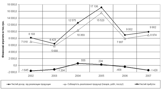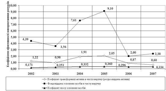 - ресурсовіддача активів у чисту виручку від реалізації у 2006 році знизилась в 2,0 – 2,5 рази відносно рівня 2005 року, тобто частка активів стала використовуватися неефективно, у 2007 році тенденція падіння ресурсовіддачі продовжилась падінням з рівня 0,87 у 2006 році до рівня 0,6 у 2007 році.