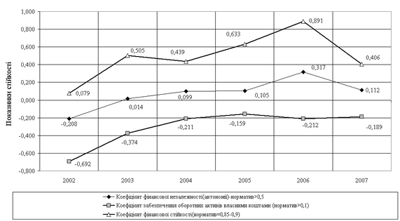 Рис.3.5. - Динаміка показників незалежності та фінансової стійкості в АТЗТ компанія "Бастіон" у 2002 – 2007 роках