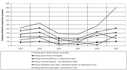 Аналіз оборотності агрегатів оборотних активів (рис.3.9) також показує, що на протязі 2006 -2007 років, після пожвавлення рівня ділової активності у 2004 -2005 роках, період обороту агрегатів оборотних активів різко зріс, що свідчить про падіння темпу ділової активності підприємства. Таким чином, підтверджується, що частка активів стала використовуватися неефективно.
