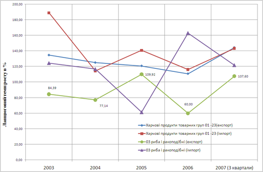 Аналіз динаміки росту абсолютних обсягів експорту та імпорту загальної товарної маси товарів харчової промисловості (рис.2.3), продукції рибної галузі (рис.2.2) та динаміки показників ланцюгового темпу щорічного росту обсягів експорту та імпорту загальної маси товарів харчової промисловості України та рибної підгалузі у 2003 -2007 роках (рис.2.3) показує, що:
