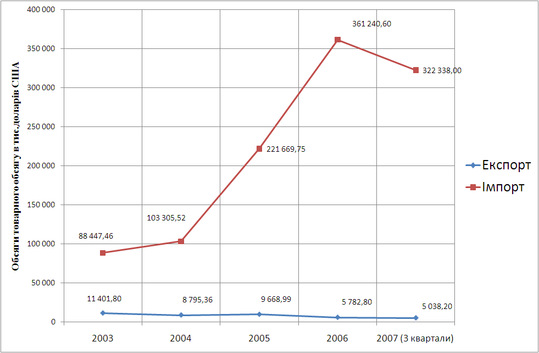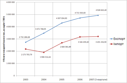 загальний щорічний обсяг експорту в зовнішній торгівлі України зріс з рівня 23,07 млрд.дол.США у 2003 році до рівня 40,0 млрд..дол.США у 2007 році (3 квартали), загальний щорічний обсяг імпорту в зовнішній торгівлі України зріс з рівня 23,02 млрд.дол.США у 2003 році до рівня 48,2 млрд.дол. США у 2007 році (3 квартали),
