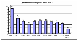Рис.2.8. - Динаміка падіння обсягів вилову риби в РФ у 1991 –2002 роках