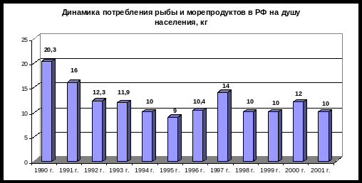 Комплекс згаданих факторів приводить до скорочення споживання риби навіть в історично риболовецькій Росії з виходом до 3-х океанів. З 1985 по 2006 р. середньоособове споживання рибних продуктів у РФ упало з 22,5 до 12,6 кг у рік при рекомендуємому Академією медичних наук Росії обсязі споживання на рівні 23,7 кілограма/рік. При цьому в США цей показник складає 22,6 кілограма/рік, у Китаї — 25,7кг/рік, у Норвегії — 47,4 кг/рік, у Японії — 64,7 кілограма/рік.