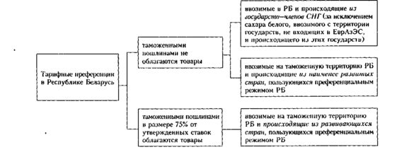 Согласно Закону РБ «О таможенном тарифе» при осуществлении торгово—политических отношений РБ с иностранными государствами допускается установление преференций по таможенному тарифу РФ в виде освобождения от оплаты пошлиной, снижение ставок пошлин либо установление тарифных квот на преференциальный ввоз (вывоз) в отношение товаров.