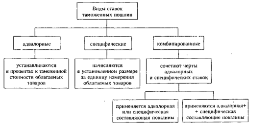 Ставки пошлин установлены постановлениями Совета Министров от 28 июня 2002 г. № 864 «Об утверждении ставок вывозных таможенных пошлин» и № 865 «Об утверждении ставок ввозных таможенных пошлин». В данных постановлениях применяются адвалорные, специфические и комбинированные виды ставок (схема 1.1).