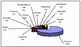 Самые крупные импортные операции ОАО «Кожевенный завод Гатово» осуществляет с Россией (Приложение И), на долю которой приходится 78%. Второе место по объему импортных операций занимает Чехия – 6%. Потом идут: Германия, Франция, Великобритания, Литва, Италия (Приложение К). Экспортные операции отражены на рис. 2.3.