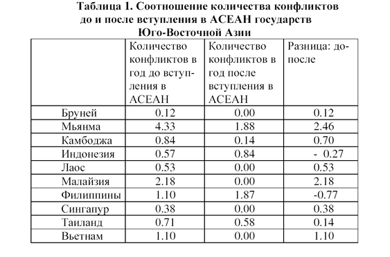 После вступления государств Юго-Восточной Азии в АСЕАН непосредственно сократилось количество межгосударственных конфликтов между самими членами Ассоциации. В качестве одного из факторов, подкрепляющих данные положения, могут рассматриваться внутренние эффекты от деятельности АСЕАН: попытки сформировать особую региональную идентичность и нормативную культуру, а также в целом поворот стран региона к целям развития вместо конфликтности, проявляющийся в акте присоединения к региональной организации сотрудничества16. При этом участие в региональном объединении отнюдь не означало стремления к транснациональному или наднациональному союзу, а скорее к созданию институциональному формата мирного согласования позиций17.