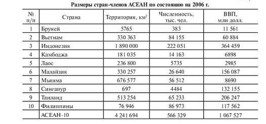 С момента учреждения АСЕАН, эта региональная группировка проявляет себя как один из самых динамично развивающихся субрегионов мира, для которого характерны высокие, устойчивые темпы экономического роста. Структурный кризис в мировом хозяйстве и циклические спады не поколебали их намерения идти по избранному пути47. В течение последних 10 лет рост ВВП в странах АСЕАН был устойчивым и в среднем вдвое превышал общие показатели экономического роста в мире. Показатель ВВП на душу населения в странах АСЕАН постоянно возрастает и в 2006 г. составил в Брунее – 25,2 тыс. долл; Камбодже – 3,37; Индонезии – 4,35; Лаосе – 2,51; Малайзии – 12,47; Мьянме – 2,06; Филиппинах – 5,37; Сингапуре – 32,98; Таиланде – 9,63; Вьетнаме – 3,4, средний по АСЕАН – 5,0348. При этом Бруней и Сингапур входят в число лидеров сообщества по данному показателю. В докладе Всемирного банка об индикаторах мирового развития базовыми критериями величины страны названы территория, население и экономика (ВВП). Эти три размерных параметра — размеры территории, населения и экономики— напоминают триаду классических факторов производства: земля, труд, капитал49.