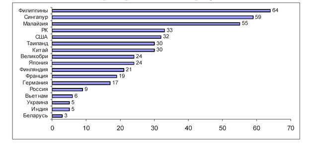 Лидером по расходам на НИОКР в ВВП являются: Сингапур, который финансирует науку на уровне развитых стран мира – 2,36%, Таиланд – 0,24%; Малайзия – 0,63%. Это сравнение только в круге самых трех сильных стран АСЕАН. Если сравнить с остальными странами региона, то наблюдается еще большее расхождение. Однако нужно учитывать, что масштабы итоговых сумм несопоставимы из-за различий в объемах ВВП этих стран с Сингапуром61.