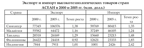 Данные таблицы свидетельствуют, что среди экономических лидеров из 10 стран АСЕАН, экспорт высокотехнических товаров развивался более интенсивно в Сингапуре: рост в 2001.2005гг. в 1,38 раза (с 77,3 млрд. долл. США до 106,57 млрд. долл. США), в Таиланде и Малайзии. На Филиппинах экспорт снизился, а в Индонезии почти не изменился58.