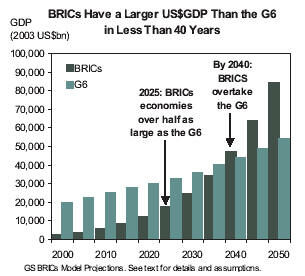 В частности, гипотеза о «БРИК» была обсуждена в серии передач Всемирной службы радио BBC в октябре – ноябре 2005 г., в которой принимали участие ведущие мировые эксперты. В частности, отмечалось, что существующие экономические тенденции действительно могут позволить Китаю занять место глобального лидера в области промышленного производства, а Индии (что, правда, несколько менее вероятно) – области сервиса и информационных технологий. В то же время, экономики России и Бразилии сохраняют сырьевую ориентацию, что не сможет, без существенных качественных перемен, обеспечить этим странам места в группе мировых экономических лидеров. В то же время, по мнению экспертов, приглашенных BBC, в России и Бразилии отсутствуют ключевые предпосылки для подобного «прорыва»: эффективное управление, стабильные и предсказуемые «правила игры». Более того, Россия, будучи часть «глобального Севера», в отличие от остальных стран «БРИК», сталкивается с катастрофическим демографическим кризисом, а ее интеллектуальный потенциал в значительной мере недоиспользован и имеет устойчивую тенденцию к снижению.