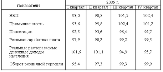 Реализация антикризисных мер Правительства Российской Федерации способствовала стабилизации социально-экономической ситуации в стране и переходу к положительным темпам экономического роста. В результате в июне - июле 2009 г. произошел перелом в экономической динамике и наблюдался рост ВВП (с учетом исключения сезонного и календарного факторов). В целом ожидается, что переход к положительной экономической динамике уменьшит спад ВВП во II полугодии и в целом по итогам года он составит 8,5 процентов.