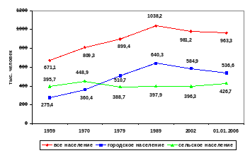 Все послевоенные переписи отмечали рост населения, и только перепись 2002 г. зафиксировала снижение, которое составило по сравнению с итогами переписи 1989 г. - 50,9 тыс. чел. Доля городского населения в общей численности населения республики до 1989 г. постоянно росла, переписью 2002 г. отмечено сокращение доли городского населения с 61,7% до 59,7%. Снижение численности городского населения обусловлено, с одной стороны миграционным оттоком, а с другой – происходящим процессом административно-территориальных преобразований. После переписи 2002 г. 12 поселков городского типа были преобразованы в сельские населенные пункты, в которых на дату переписи проживало 35,1 тыс. чел. (рисунок 2).