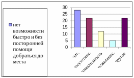 Столько же – "дискриминация, получение должности другими претендентам (здесь среди причин указывались такие как пренебрежение к инвалидам, заведомая предубежденность против них, отсутствие реальной конкуренции на рынке труда, так как при трудоустройстве нередко используются связи и все попытки инвалидов устроиться на работу оказывались безуспешными, так как свободное место оказывалось занято теми людьми, которые были как-то знакомы с работодателем). Оставшиеся отметили иные причины (ни разу не пытались устроиться на работу, предлагаемый работодателем график и условия работы в организации были заведомо неподходящими для устраивающегося на работу человека с ограниченными возможностями )