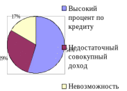 1) недостаточный совокупный доход 2) высокий процент по кредиту 3) невозможность накопить средства для первоначального взноса 4) другие