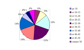 1) до 10 2) от 10-15 3) от 15-20 4) от 20-25 5) от 25-30 6) от 30-35 7) от 35-40 7) от 40-45 8) от 45-50 9) свыше 50