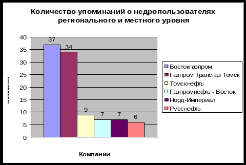 Среди недропользователей регионального и местного уровня заметнее всего присутствие в СМИ дочерних обществ ОАО "Газпром": ОАО "Востокгазпром" (37 материалов) и ОАО "Газпром трансгаз Томск" (34 материала), проводящих системную информационную политику. По количеству материалов, касающихся социальной ответственности компании, лидирует Газпром Трансгаз Томск (16 материалов). Весомую долю в медийном потоке, сформировавшемся вокруг темы социальной ответственности ООО "Газпром Трансгаз Томск" в четвертом квартале 2008 года составляют материалы, связанные с корпоративным фестивалем самодеятельных коллективов "Новые имена", проходившем в ноябре. Социальной ответственности ОАО "Востокгазпром" посвящено 9 материалов, касающихся, главным образом, открытия стадиона в Каргаске. Немногочисленные материалы, связанные с социальной деятельностью "Газпром нефть - Восток", посвящены сотрудникам компании. Среди материалов, посвященных другим недропользователям Томской области, нет ни одного упоминания о социальной ответственности этих компаний.