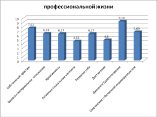 В сфере профессиональной жизни следует обратить внимание на низкие значения ценностей активных социальных контактов и достижений. Особо можно отметить высокий показатель духовного удовлетворения.