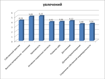 Сфера увлечении характеризуется довольно низкими общими показателями и низким общим баллом. При этом следует отметить достаточно высокий уровень креативности и материального положения. Это свидетельствует о повышенной степени прагматизма сотрудников, однако сфера увлечений в их деятельности низко выважена.