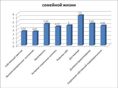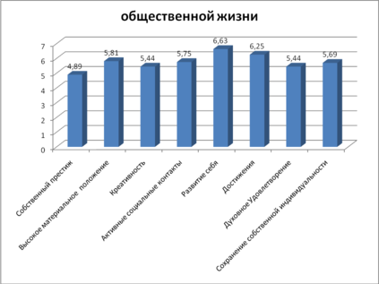 В сфере общественной жизни показатели более или менее однородны, что свидетельствует о том, что по мнению сотрудников в глазах общества их работа получает достаточно высокую оценку. Самый высокий показатель получился в терминальной ценности развития себя и достижений. Показатель собственного престижа самый низкий.