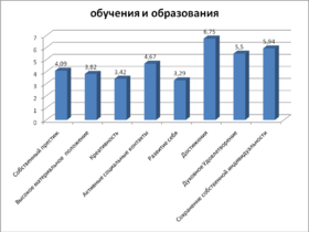 Высокое материальное положение в сфере образования и обучения выражается в стремлении человека иметь такой уровень образования, который гарантирует высокую зарплату и другие виды материальных благ. Испытуемые показали низкий балл по этому показателю, что характеризуются небольшим желанием повышать уровень своего образования, если существующий его уровень не приносит желаемого материального благополучия. Следовательно можно сделать вывод об отсутствии стремления к дополнительному образованию.