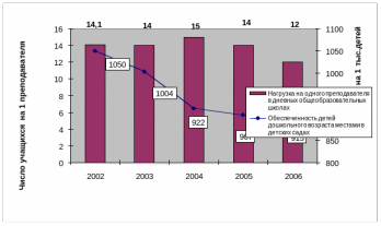 В общеобразовательных учреждениях нагрузка на 1 преподавателя сложилась в среднем по городу за 2006 год 12,8 чел. при максимальном соотношении 15 чел. в 2002 году.