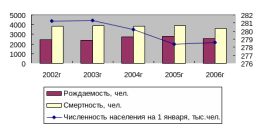 За рассматриваемый период отмечен рост рождаемости с 2444 чел. в 2002 году до 2795 чел. в 2005 году, когда был отмечен наивысший уровень рождаемости. Смертность в 2002 году составила 3845 чел., в 2003 году – 3902 чел. В 2004-2005 гг. наблюдается некоторое снижение смертности населения города на 68 чел. по сравнению с 2003 годом, когда был отмечен ее наивысший уровень.