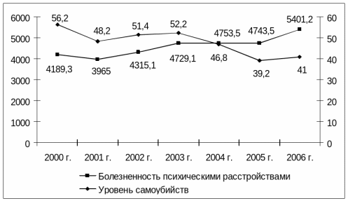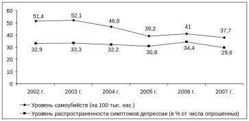 На протяжении периода 2002-2006 гг. динамика распространенности симптомов депрессии имела те же тенденции, что и показатель смертности населения от самоубийств. То же самое можно сказать, анализируя динамику распространенности завершенных суицидов и болезненности психическими расстройствами. Из этого можно сделать вывод о том, что малейшие изменения в психическом здоровье населения (особенно на пограничном, непатологическом уровне) мгновенно отражаются на уровне суицидальной активности.