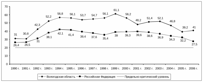 В среднем за период с 1999-2006 гг. уровень смертности от самоубийств на территории Вологодской области был больше, чем в целом по России.